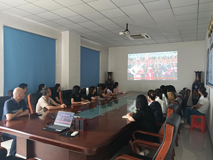 當天上午,黨員們齊聚公司會(huì )議室,懷著(zhù)崇敬的心情等待閱兵儀式開(kāi)始。9時(shí)許,閱兵儀式正式拉開(kāi)帷幕,當屏幕中出現整齊列隊的受閱方隊、先進(jìn)精良的武器裝備以及翱翔天際的空中梯隊時(shí),大家紛紛被震撼,會(huì )議室里不時(shí)傳來(lái)陣陣贊嘆聲。