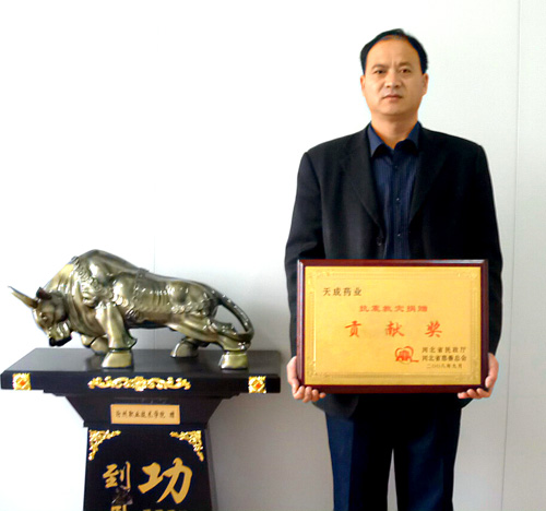 汶川大地震,捐獻價(jià)值100萬(wàn)藥品,職工集資38560元。九月份,被河北省民政廳、慈善總會(huì )授予抗震救災貢獻獎。副總王顥捧著(zhù)這塊獎牌非常高興。