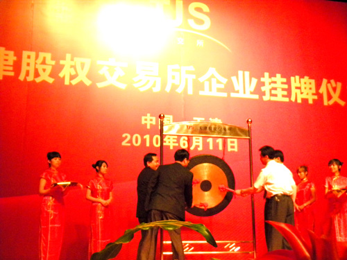 2010年6月11日上午9點(diǎn)29分,一個(gè)讓天成人永遠銘記的時(shí)刻,隨著(zhù)四柄紅槌一起敲響天交所的開(kāi)市銅鑼?zhuān)颖碧斐伤帢I(yè)股份有限公司股權在天津股權交易所鳴鑼開(kāi)市,當日成交338000股,成交金額118.3萬(wàn)元。