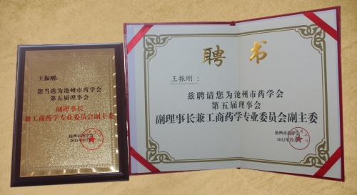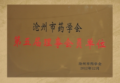2013年3月份,由滄州市藥學(xué)會(huì )頒發(fā)給我公司“滄州市藥學(xué)會(huì )第五屆理事會(huì )員單位”銅牌,并聘請我公司董事長(cháng)、總經(jīng)理為滄州市藥學(xué)會(huì )第五屆理事會(huì )副理事兼藥學(xué)專(zhuān)業(yè)委員會(huì )副主委。