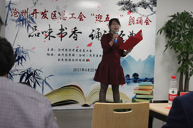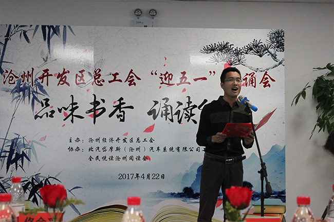2017年4月22日,滄州開(kāi)發(fā)區總工會(huì )主辦,北汽岱摩斯(滄州)汽車(chē)系統有限公司工會(huì )、全民悅讀滄州閱讀會(huì )協(xié)辦的“迎五一誦讀會(huì )”如期舉行。此次朗讀會(huì )主題為“品味書(shū)香,誦讀經(jīng)典”,是為打造滄州東部新城,在開(kāi)發(fā)區推廣全民閱讀的一次嘗試。我公司職工劉艷麗、鄭福貴分別在會(huì )上深情朗讀了詩(shī)歌《相信未來(lái)》、《希望,展翅飛翔》。